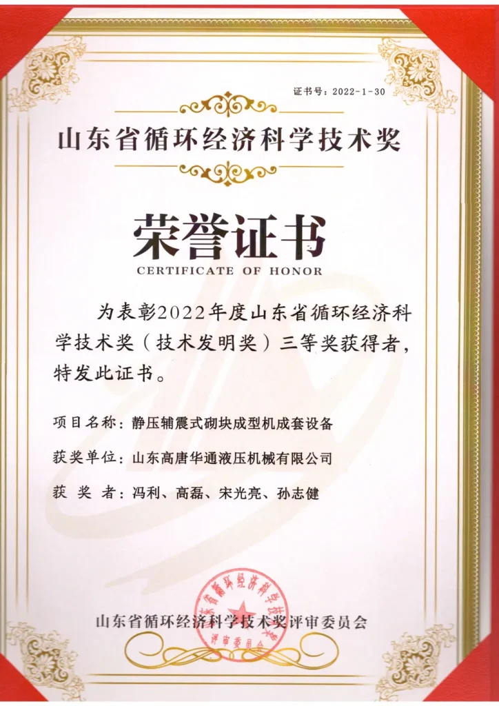 Компания была последовательно удостоена: сертификата «Сертификация уровня внутреннего лидерства», выданного Государственным комитетом по науке и технике; сертификата «Высокотехнологичное предприятие», выданного Департаментом науки и техники провинции Шаньдун; сертификата на продукцию первого (первого комплекта) в производстве и звания «Специализированное, утонченное, особенное и новое» предприятие, присвоенных Департаментом промышленности и информатизации провинции Шаньдун; «Патентной премии провинции Шаньдун», присужденной Департаментом науки и техники провинции Шаньдун; звания «Фирменный продукт Шаньдуна», присвоенного Комитетом по продвижению брендовой стратегии провинции Шаньдун; звания «Инженерно-технический исследовательский центр механического оборудования», присвоенного Бюро науки и техники города Ляочэн; муниципального центра промышленного дизайна города Ляочэн; членства в Комитете по стандартам национальной строительной материаловской промышленности; звания продукции, соответствующей отраслевым стандартам национальной строительной механической отрасли.